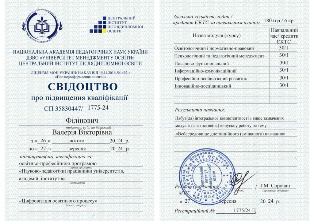 У 2024 р. пройшла підвищення кваліфікації ДЗВО «Університет менеджменту освіти» загальним обсягом 180 годин (6 кредитів), тема випускної роботи: «Вебсередовище дистанційного (змішаного) навчання».
