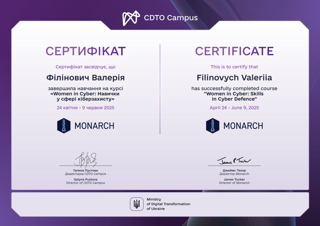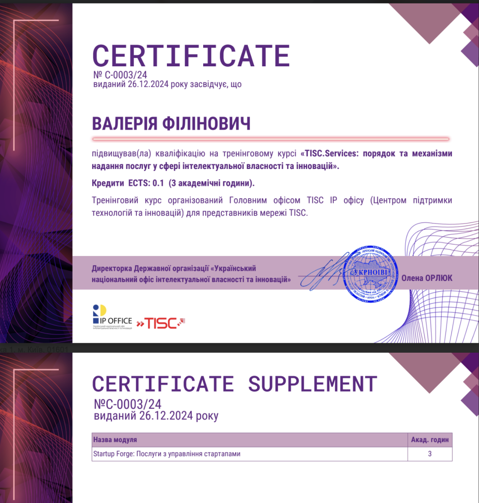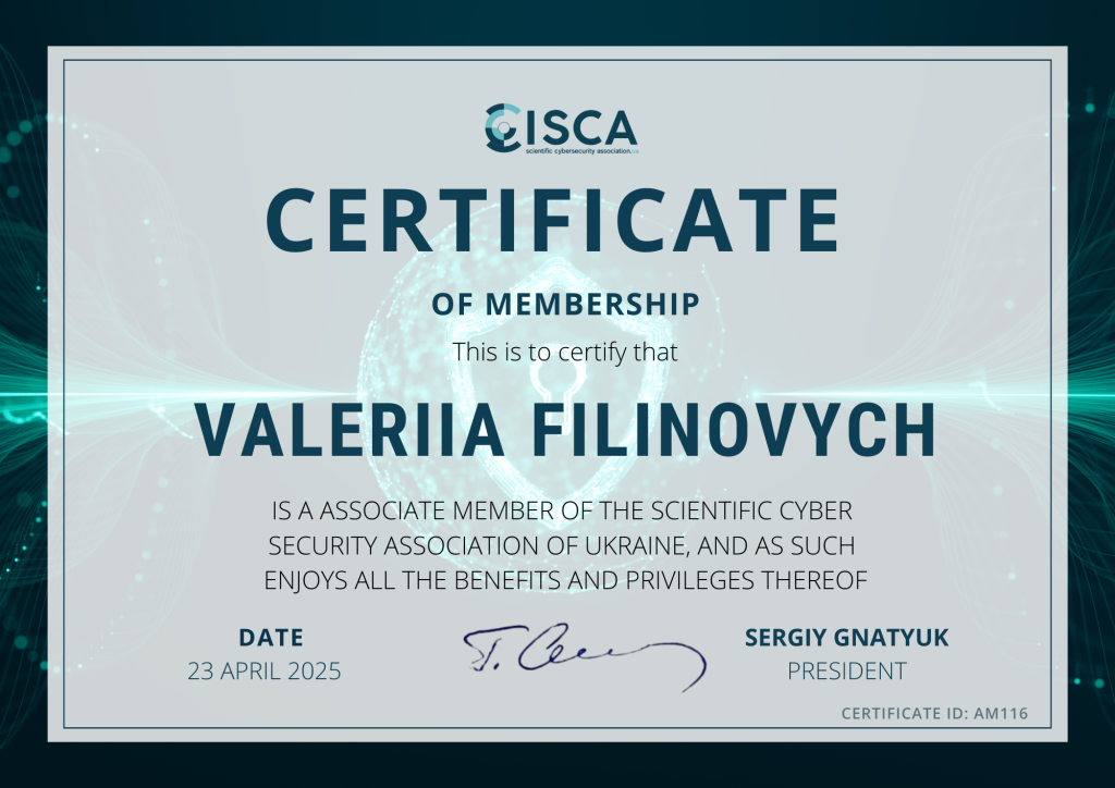 У 2025 року захистила докторську дисертацію по темі: “Забезпечення дотримання права інтелектуальної власності у кіберпросторі: світовий досвід та пропозиції для України“.
