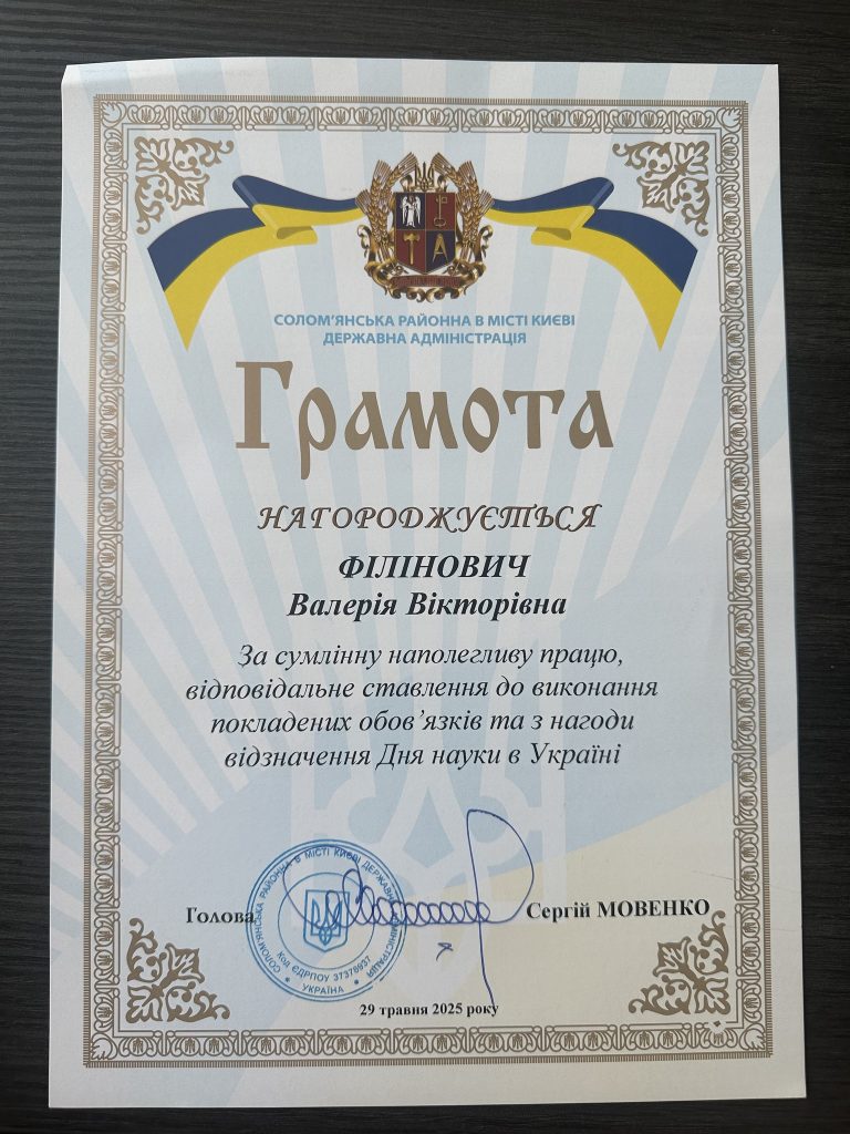 У 2025 році нагороджена грамотою за сумлінну наполегливу працю від Солом’янської районної в місті Києві держадміністрації з нагоди Дня науки.